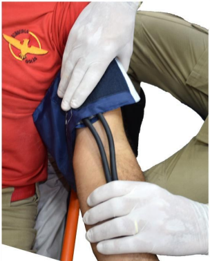 - Posicione o manguito, cerca de 2 a 3 cm acima da fossa cubital, centralizando a bolsa de borracha sobre a artéria braquial;