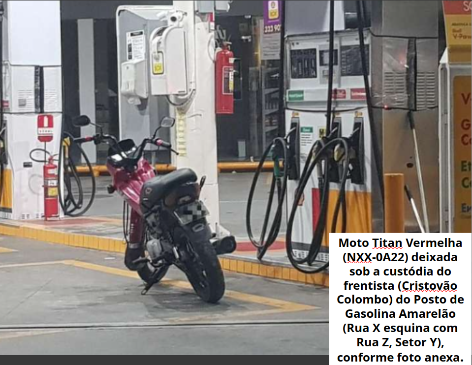 Ex.: Moto Titan Preta (NXX-0A22) deixada sob a custódia do frentista (Cristovão Colombo) do Posto de Gasolina Amarelão (Rua X esquina com Rua Z, Setor Y), conforme foto anexa;