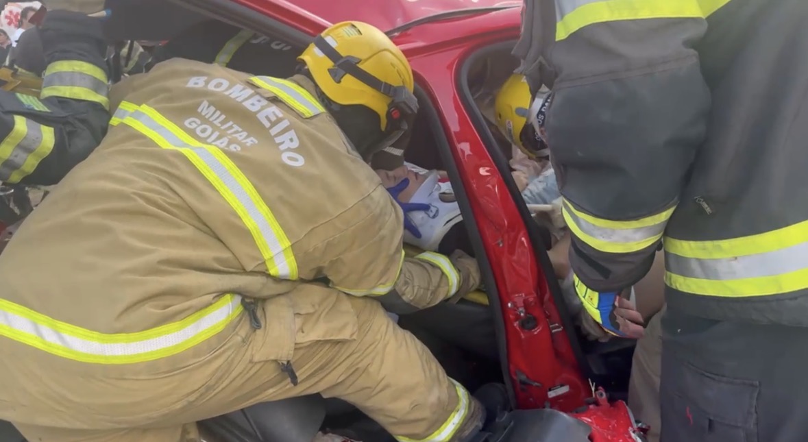 Ao chegar ao local da ocorrência, foi possível verificar que se tratava de um acidente de trânsito, carro x moto, com vítima do carro consciente e orientada, com leves escoriações em membros superiores e inferiores. Vítima da motocicleta apresentava-se também consciente e orientada, porém com fratura exposta de fêmur direito, com hemorragia exsanguinante. Realizada contenção da hemorragia com compressão direta e estabilização de membro com talas e ataduras. A vítima do carro foi transportada ao HUGO pela UR xxx e a vítima da motocicleta foi transportada ao HUGOL pela UR xxx.